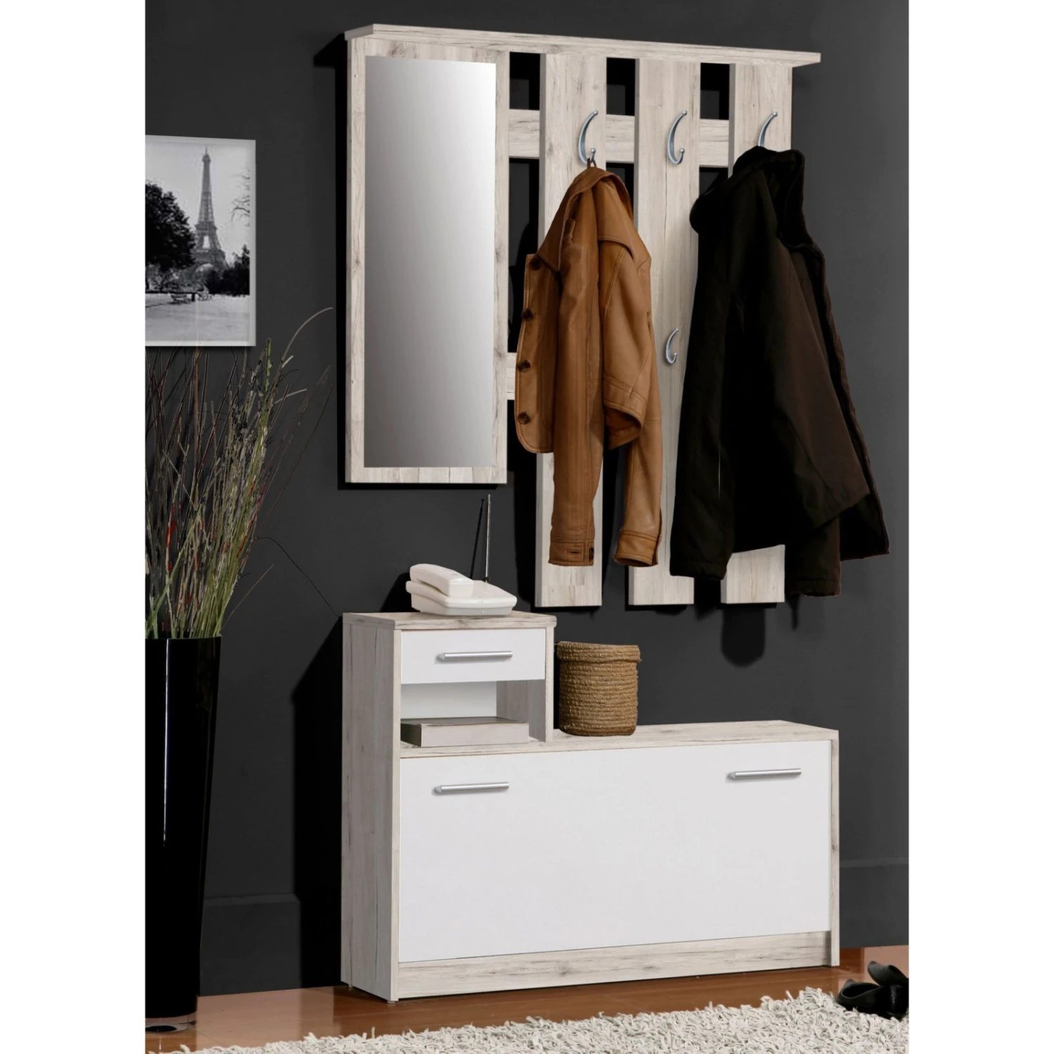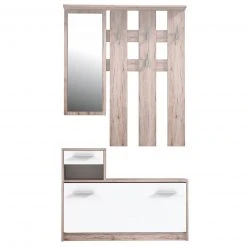 Diese attraktive Garderobe in Sandeiche Dekor und Weiß bietet Ihnen viel Platz und macht eine tolle Figur in Ihrer Diele. Die Garderobe verfügt über ein Garderobenpaneel mit vier Kleiderhaken auf zwei unterschiedlichen Höhen, einen großen Spiegel, sowie einen Unterschrank mit einer Klapptür, einem Schubkasten und einem offenen Fach. So haben Sie ausreichend Platz, um Ihre Garderobe, Schuhe und vieles mehr unterzubringen und schaffen Ordnung im Eingangsbereich Ihrer Wohnung.