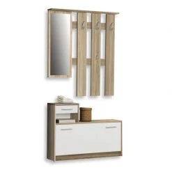 Diese fabelhafte Garderobe in Sonoma Eiche Nachbildung und Weiß bietet Ihnen jede Menge Stauraum und macht eine tolle Figur in Ihrer Diele. Die Garderobe ist ausgestattet mit einem Garderobenpaneel mit vier Kleiderhaken auf zwei unterschiedlichen Höhen, einem großen Spiegel, sowie einem Unterschrank mit einer Klapptür, einem Schubkasten und einem offenen Fach. So haben Sie viel Platz, um Ihre Garderobe, Schuhe und vieles mehr unterzubringen.