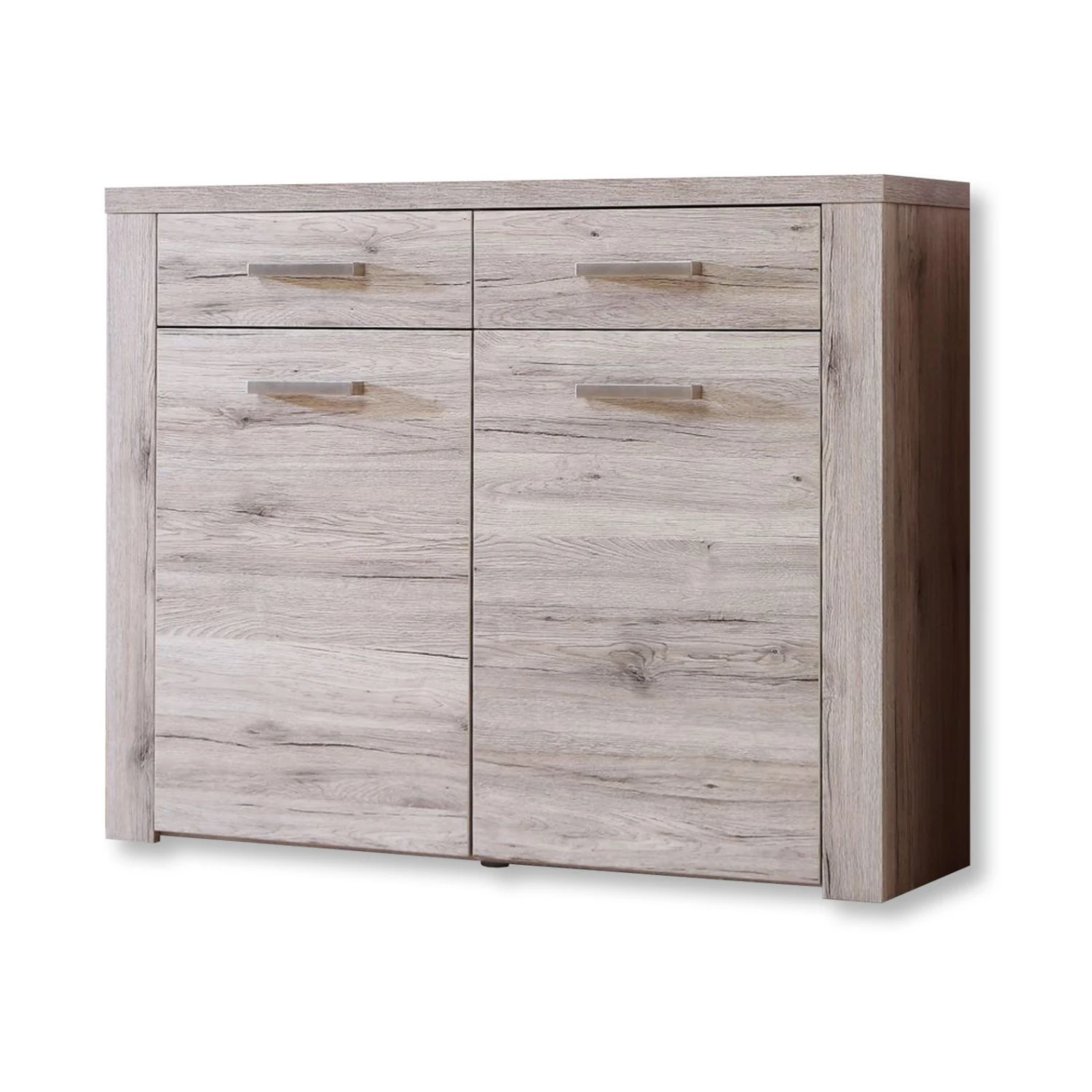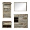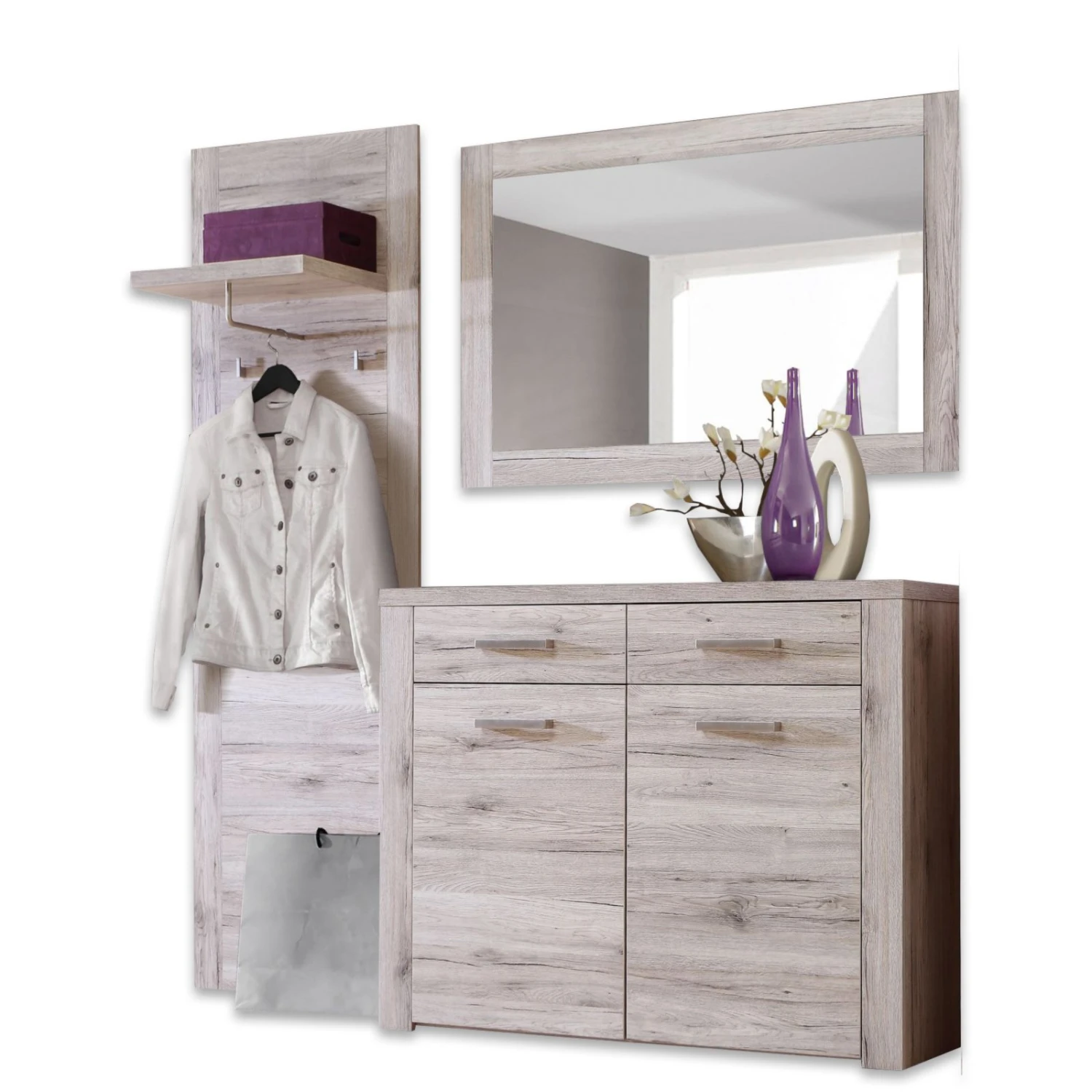 Das rundum Garderoben-Set stattet Sie mit allem aus, was in Ihrem Eingangsbereich benötigt wird. Am Garderobenpaneel finden Sie vier Metallhaken für Jacken und eine Stange an der Sie Kleiderbügel für Mäntel nutzen können. Auf der Hutablage können Sie natürlich auch Schals, Mützen oder Taschen platzieren. Im Schuhschrank finden Sie neben den beiden Schubkästen auch insgesamt sechs Fächer hinter den beiden Drehtüren. Die Einlegeböden können auf verschiedenen Höhen eingesetzt werden, so dass Sie es Ihren Bedürfnissen anpassen können. Der Spiegel ist genauso breit wie der Schuhschrank und kann daher perfekt darüber platziert werden. Für den letzten Blick, bevor Sie das Haus verlassen ist er ideal und dabei mit schöner Sandeiche umrahmt.