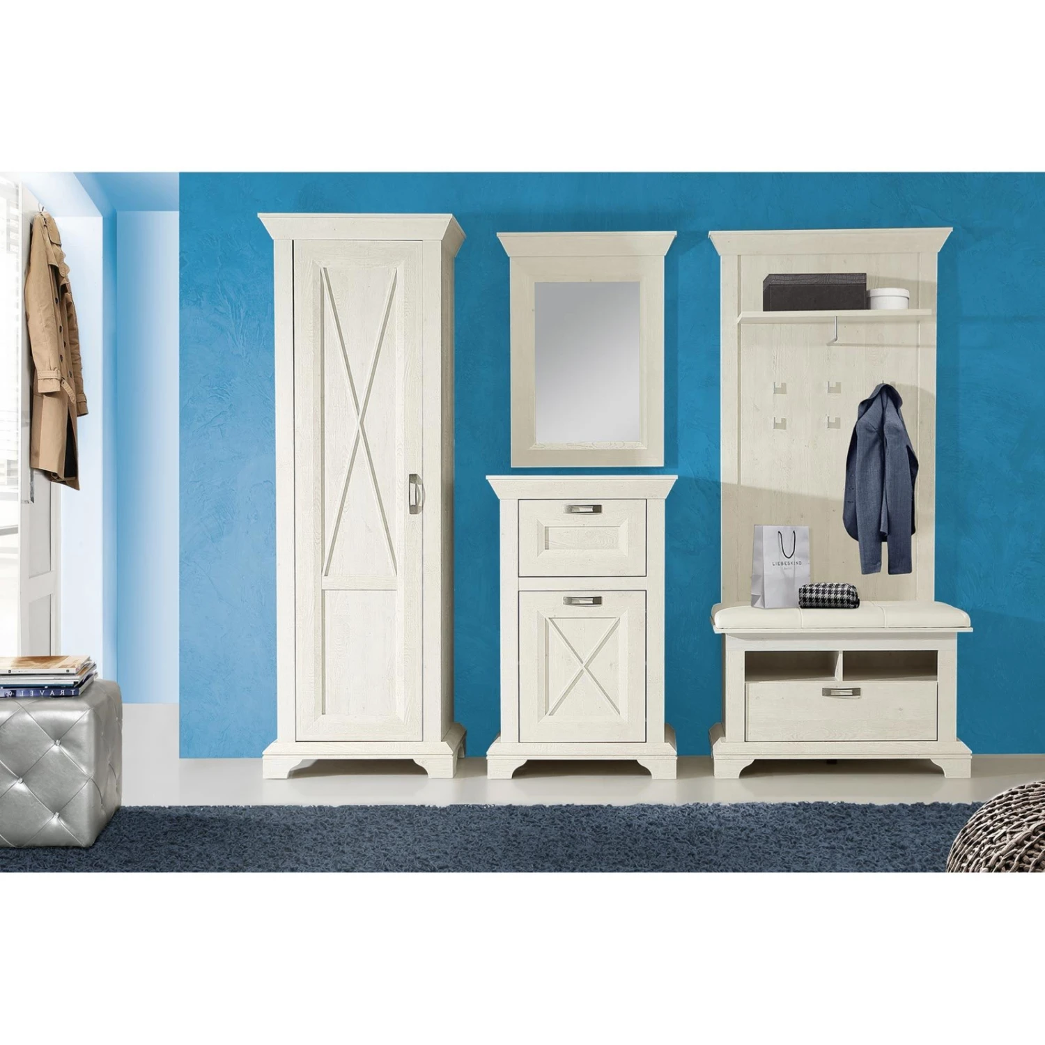 Mit dem Gaderoben-Set ist Ihr Eingangsbereich bestens ausgestattet. Im Gaderobenschrank ist ein Einlegeboden und eine ausziehbare Kleiderstange, ideal für Jacken und Mäntel, die nicht täglich benötigt werden, aber trotzdem griffbereit sein sollten, wie ein Regencape. Alles was schnell griffbereit sein sollte, findet auf einem der sechs Metallhaken oder der Kleiderstange des Wandpaneels Platz. Auf der Ablage darüber können Mützen und Kappen abgelegt werden. Das passende Schuhwerk finden Sie im Schuhschrank mit Polsterung. Handtaschen, Schlüssel und Schirme wird in der Gaderobenkommode den geeignet Platz finden. Abgerundet wird das Set mit dem Spiegel mit Pinien Umrahmung, der sich wunderbar in das Gesamtbild einfügt. Alles ist nach Belieben zu stellen oder hängen, so dass Sie es Ihren Vorstellungen anpasssen können.