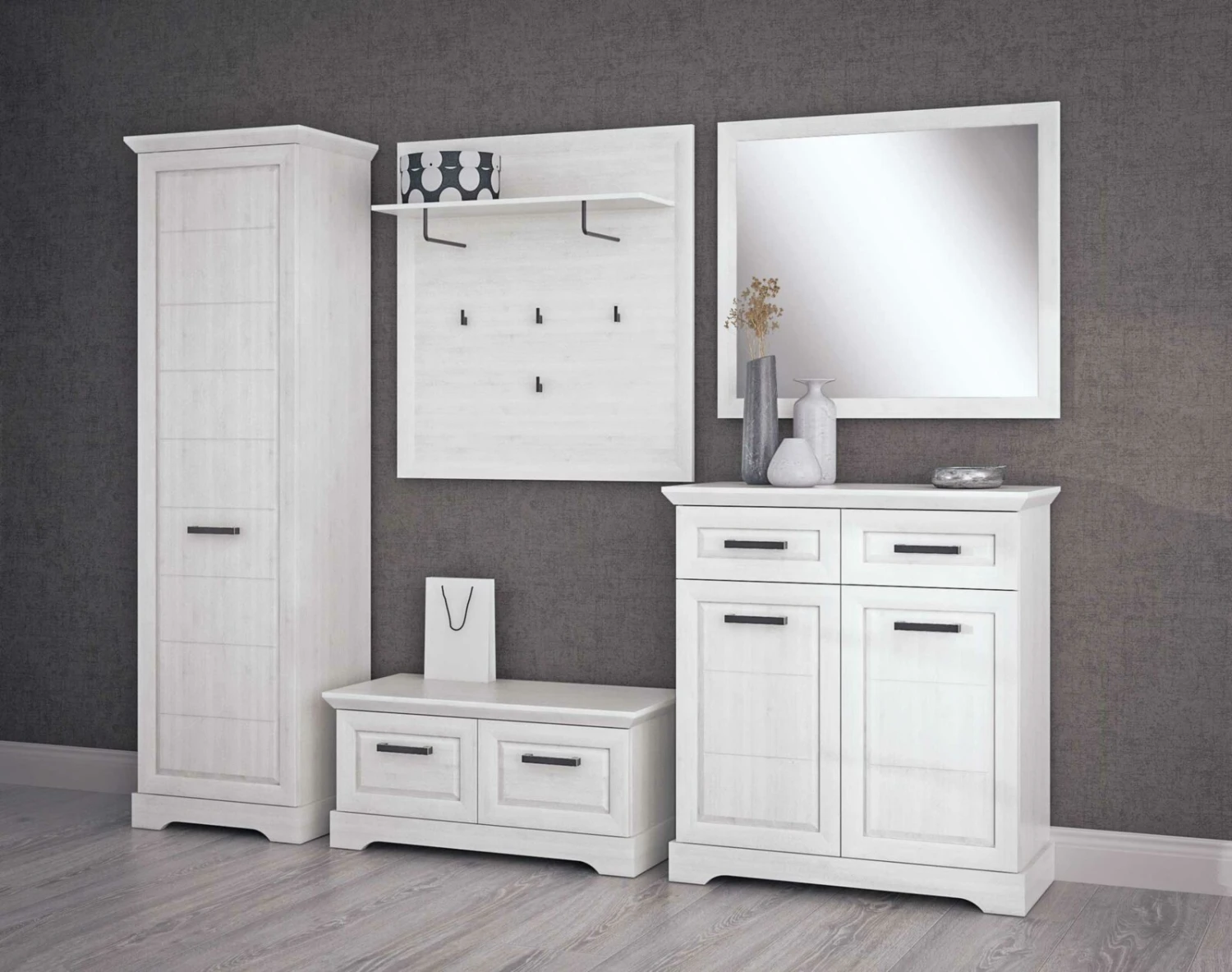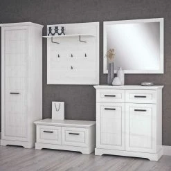 - bestehend aus: Garderobenschrank, Garderobenbank, Garderobenkommode, Garderobenpaneel, Spiegel