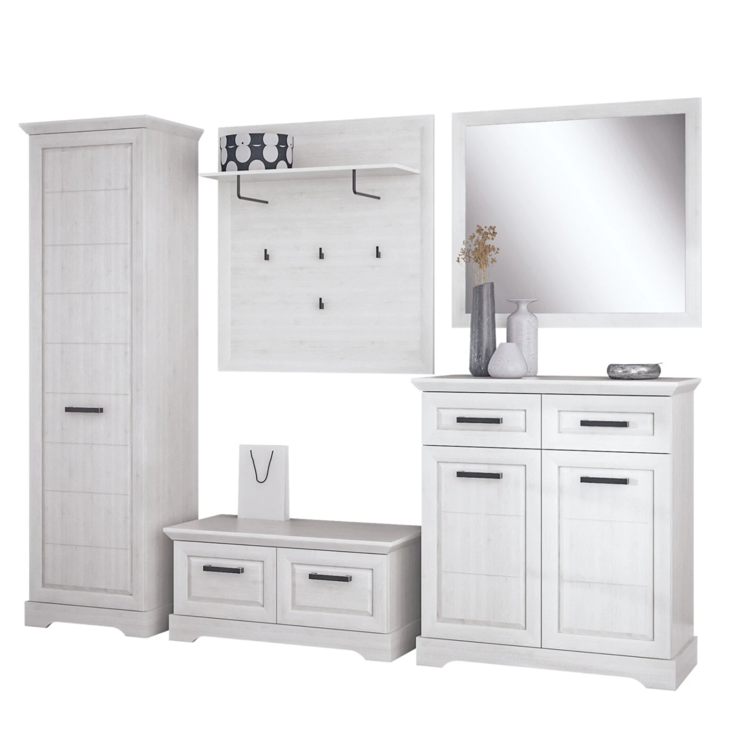 Das 5-teilige Garderoben-Set im Landhausstil bringt Funktionalität und Design stets in Ihr Heim! Verstauen Sie Ihre Kleidung stilvoll entweder in dem Garderobenschrank oder in der Garderobenkommode. Weiteren Stauraum bietet die Garderobenbank sowie das Garderobenpaneel für häufig genutzte Kleidung wie beispielsweise Jacken. Zusätzlich abgerundet wird das Angebot durch einen großen Spiegel. Die weiße Sibiu Lärche Nachbildung fügt sich ganz unaufgeregt in das Gesamtkonzept Ihrer Wohnung ein und lässt sich vielseitig kombinieren. Schwarze Metallgriffe kontrastieren gefällig das helle Design.