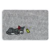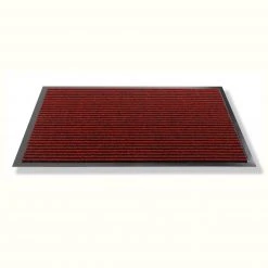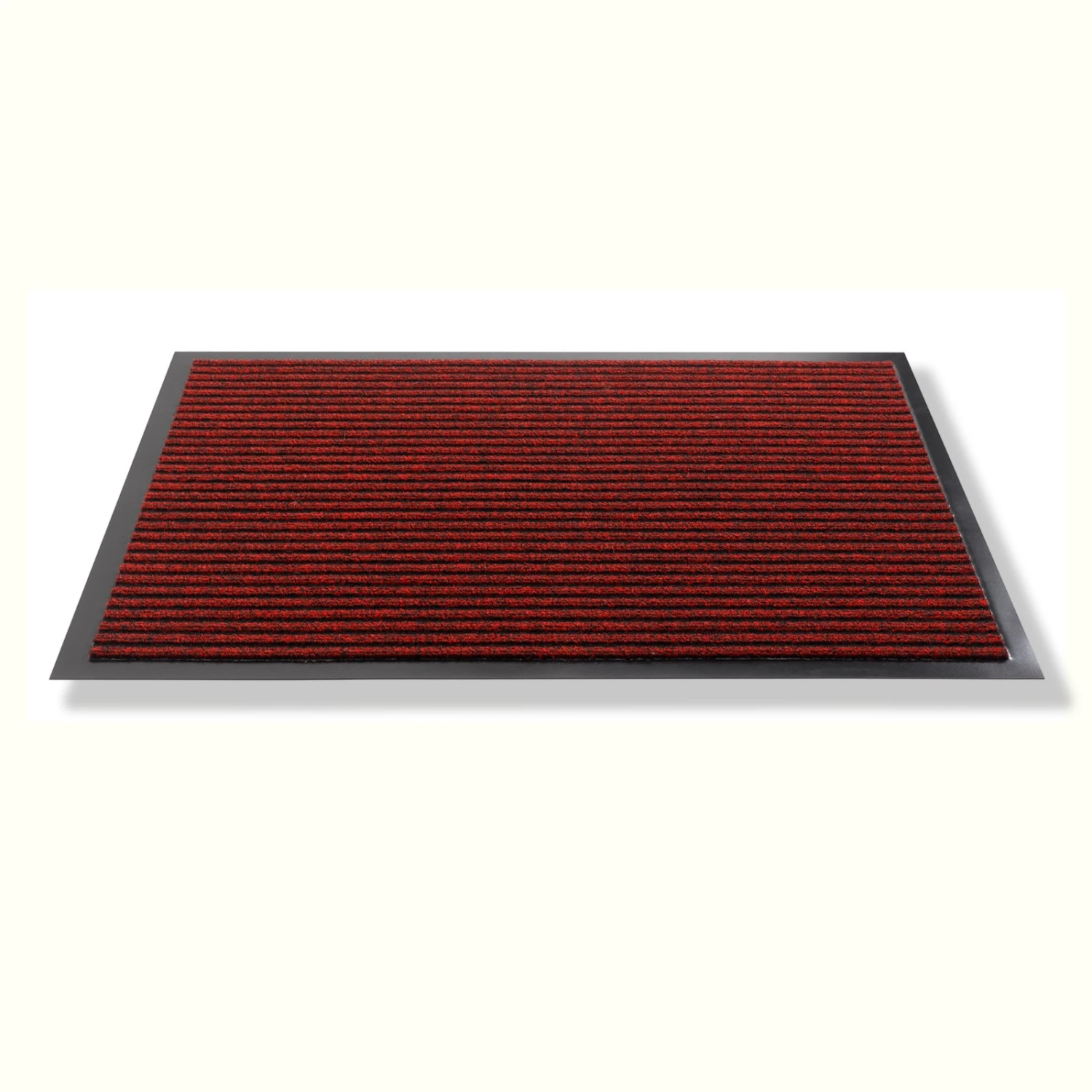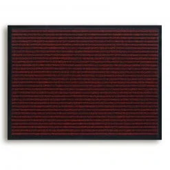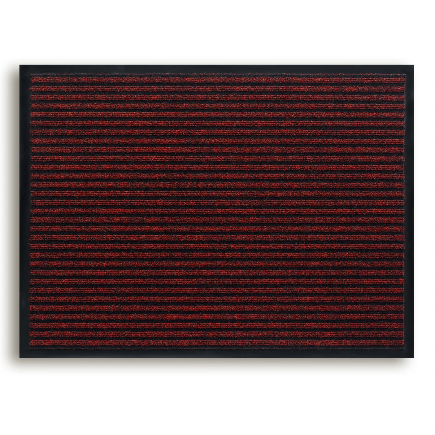 Praktische Fußmatte in Rot mit schwarzen Streifen. Die Matte besteht aus Polypropylen und die rutschfeste Gummiunterseite sorgt für guten Halt.