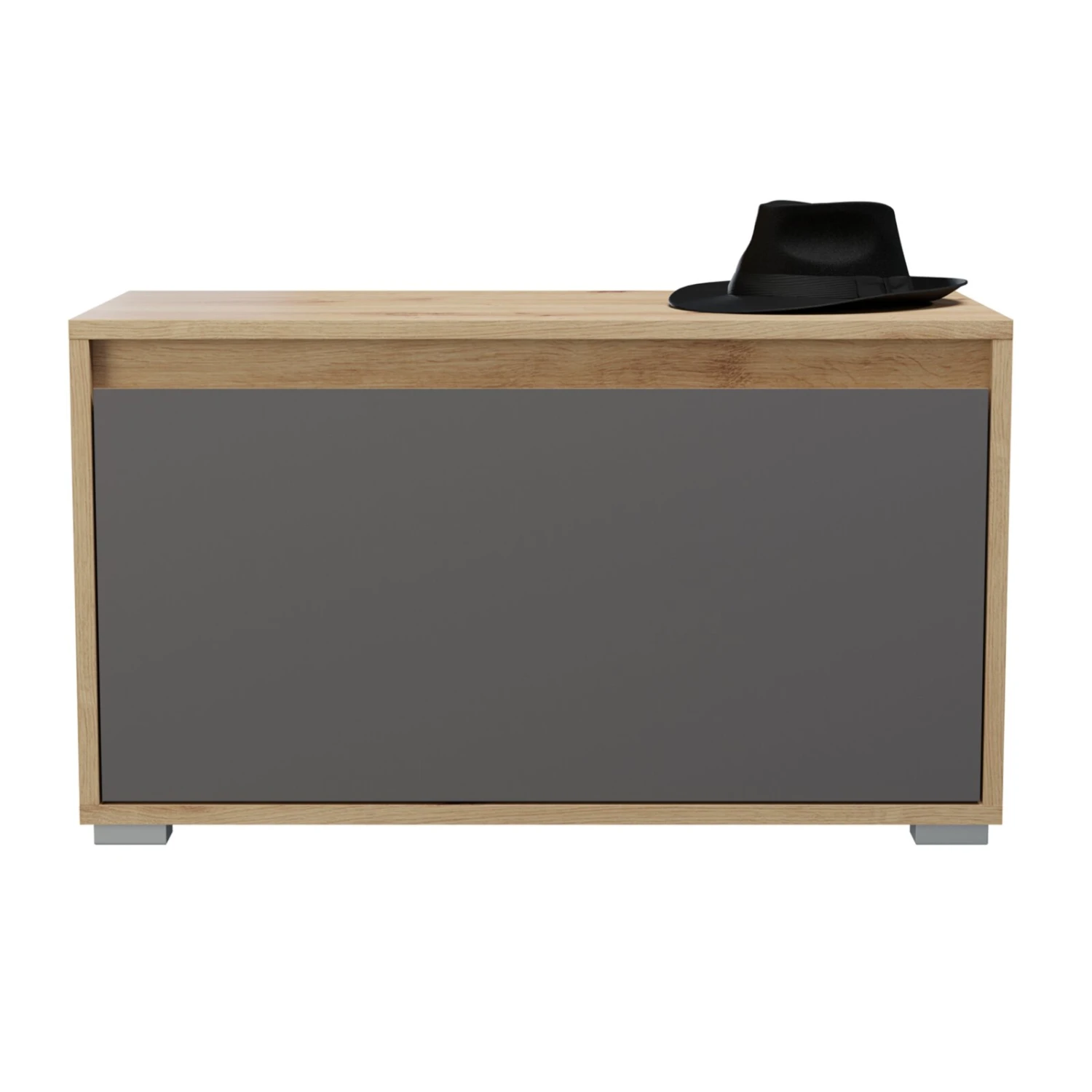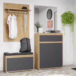 Auf diese Garderobenbank kannst du dich hinsetzen, um in Ruhe deine Schuhe anzuziehen. Hinter einer Klappe kannst du zudem deine Lieblingspaare verstauen. Auch optisch kann die Bank überzeugen. Der Korpus ist in Eiche Nachbildung gehalten und die Front in Grau.