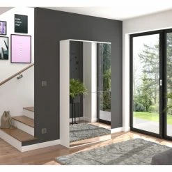 Dieser etwa 30 cm breite Garderobenschrank bringt Ihnen nicht nur genügend Staufläche, sondern auch eine große Kristallglasspiegelfront an beiden Türen. Insgesamt vier Einlegeböden teilen den Stauraum gekonnt auf.