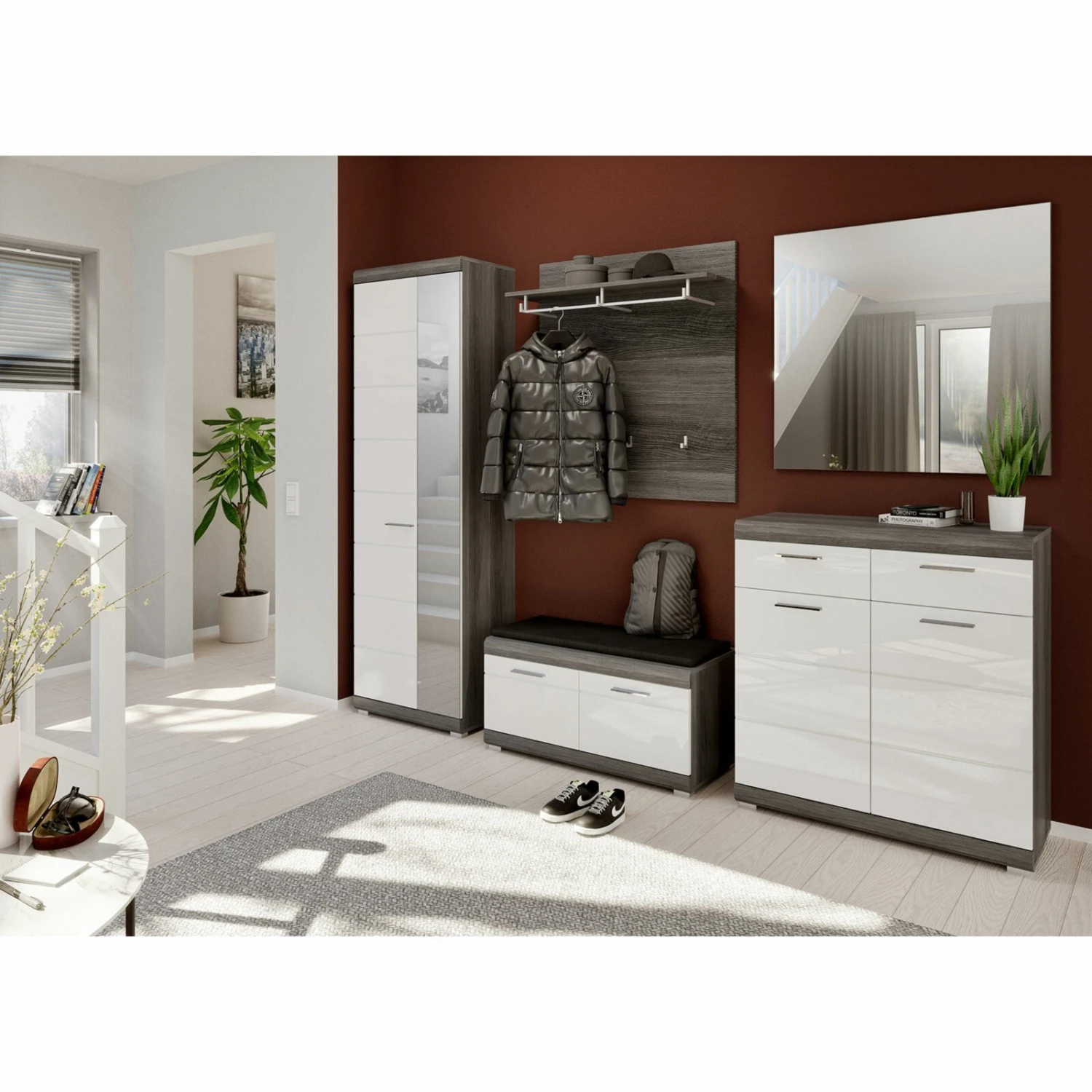 Der Garderobenschrank mit sechs Einlegeböden bietet nicht nur viel Stauraum für Schuhe oder andere persönliche Gegenstände, sondern wirkt durch die Hochglanz-Optik auch sehr edel. Dank des Spiegels können Sie vor dem Verlassen der Wohnung Ihr Outfit noch einmal prüfen.