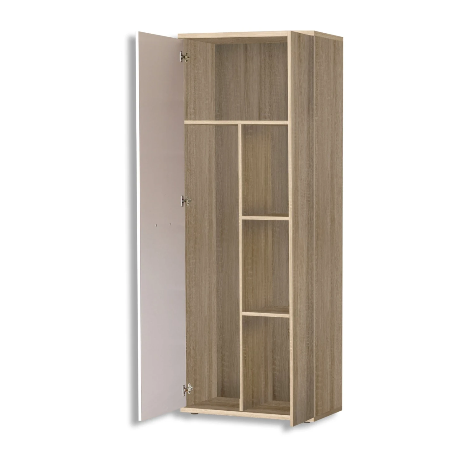 In diesem Haushaltsschrank mit 3 Einlegeböden rechts, einem geräumigen Staufach oben und einem großen Staufach links haben Sie genügend Platz um allerhand Haushaltsutensilien ordentlich zu verstauen. Der Schrank sorgt so für Ordnung und sieht dabei noch richtig gut aus.