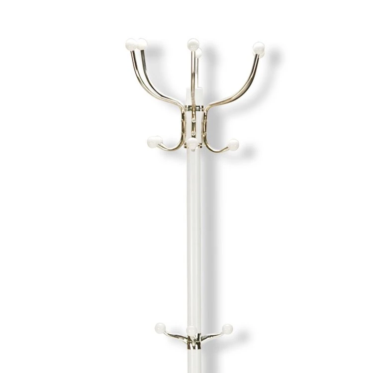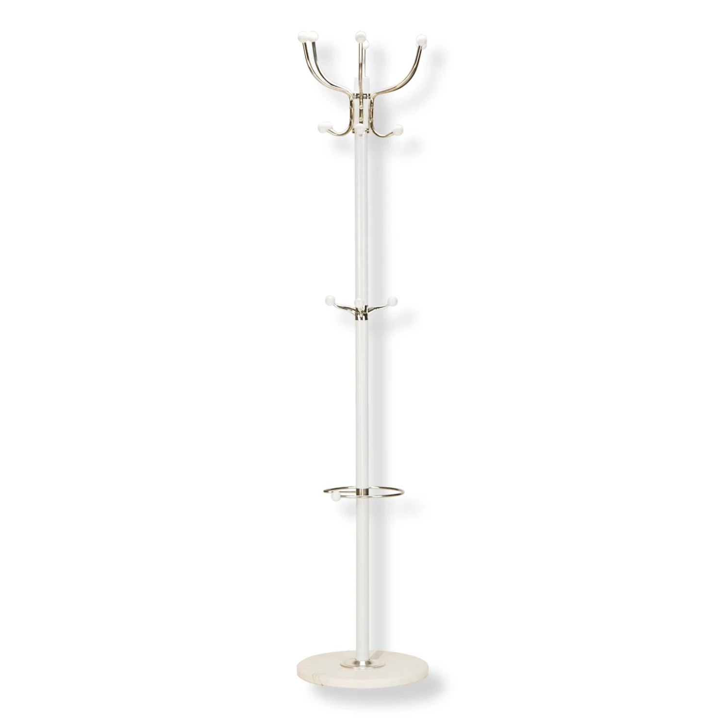 Der attraktive Kleiderständer macht Eindruck in ihrer Diele. Er besteht aus robustem Stahl, die Kleiderhaken sind verchromt und weiße Kugeln bilden einen stimmigen Abschluss. Der hochwertige und stabile Marmorfuß sorgt für einen festen Stand und rundet die Optik sehr elegant ab.