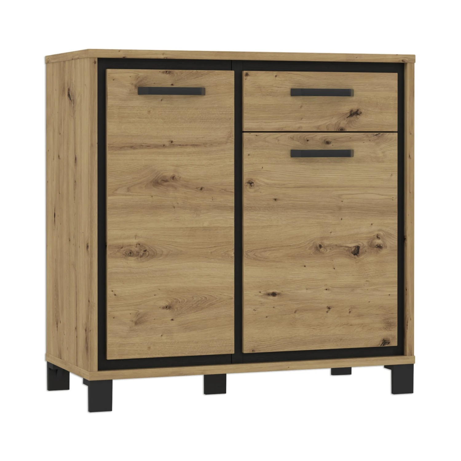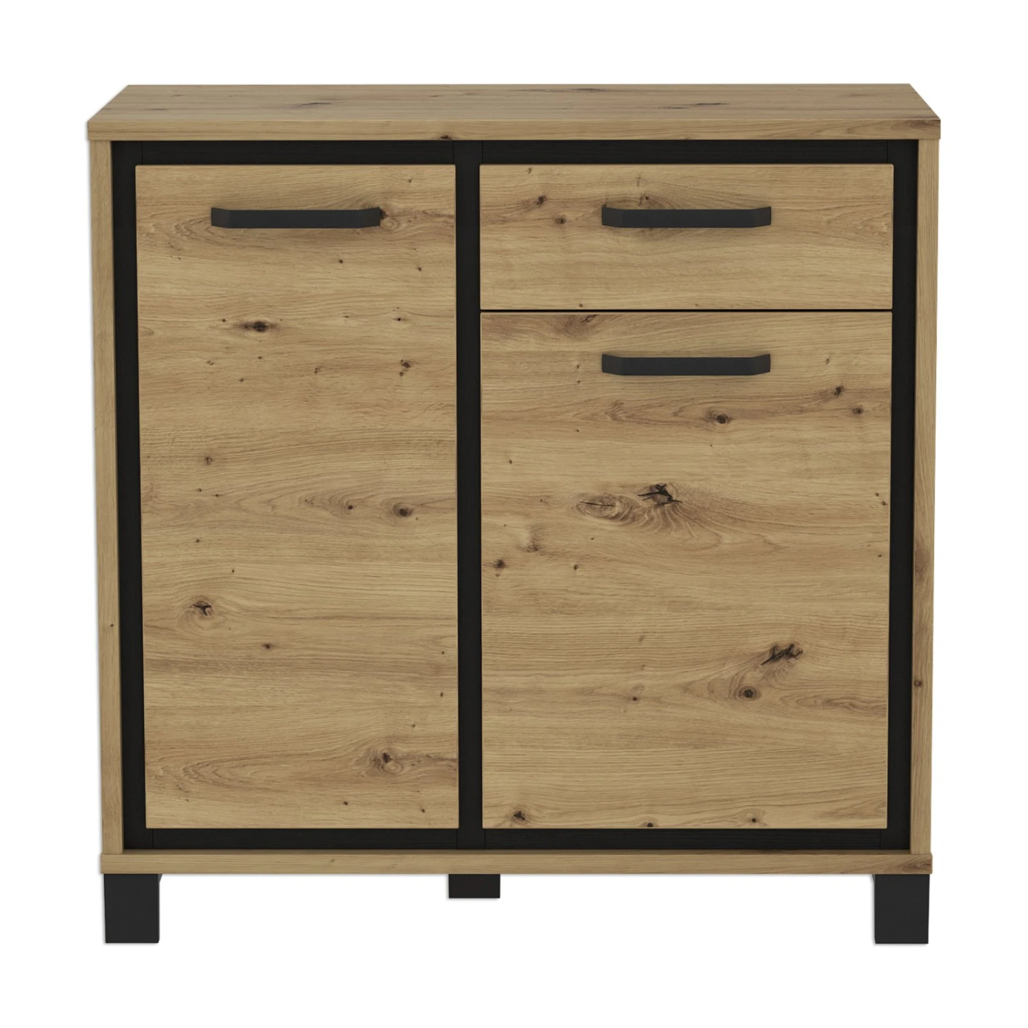 Die Kommode in Artisan Eiche Nachbildung ist durch den Absatz in Schwarzeiche Nachbildung ein toller Hingucker. Sie ist aber nicht nur das. Sie ist auch ein Ordnungshüter! Hinter den beiden Drehtüren, welche sich mit dem schwarzen Metallgriff öffnen lassen, befindet sich jeweils ein Einlegeboden und auch ein Schubkasten steht Ihnen für kleine Utensilien zur Verfügung.