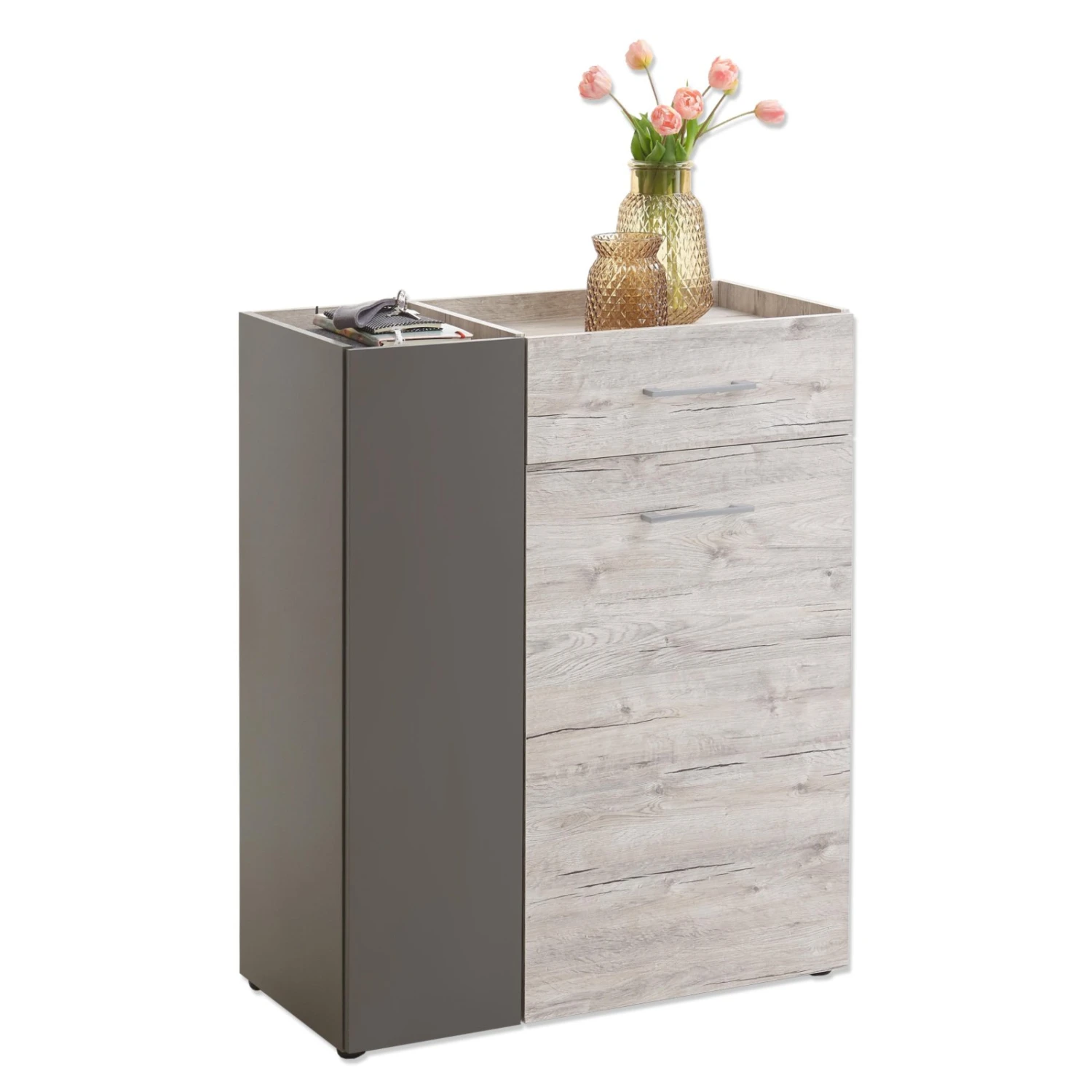Sie suchen eine platzsparende und moderne Ablagemöglichkeit für den Eingangsbereich? Dann ist diese Kommode vermutlich genau nach Ihrem Geschmack. 1 Schubkasten und 2 Türen mit 6 Fächern bieten viel Stauraum und Sortiermöglichkeiten. Die Mischung aus Sandeiche und lavafarbenen Absätzen macht die Kommode auch optisch zu einem echten Schmuckstück. So haben Sie Ihre Schlüssel, Papiere und persönlichen Gegenstände immer griffbereit an einem Ort und Sie sparen sich unnötiges Suchen.