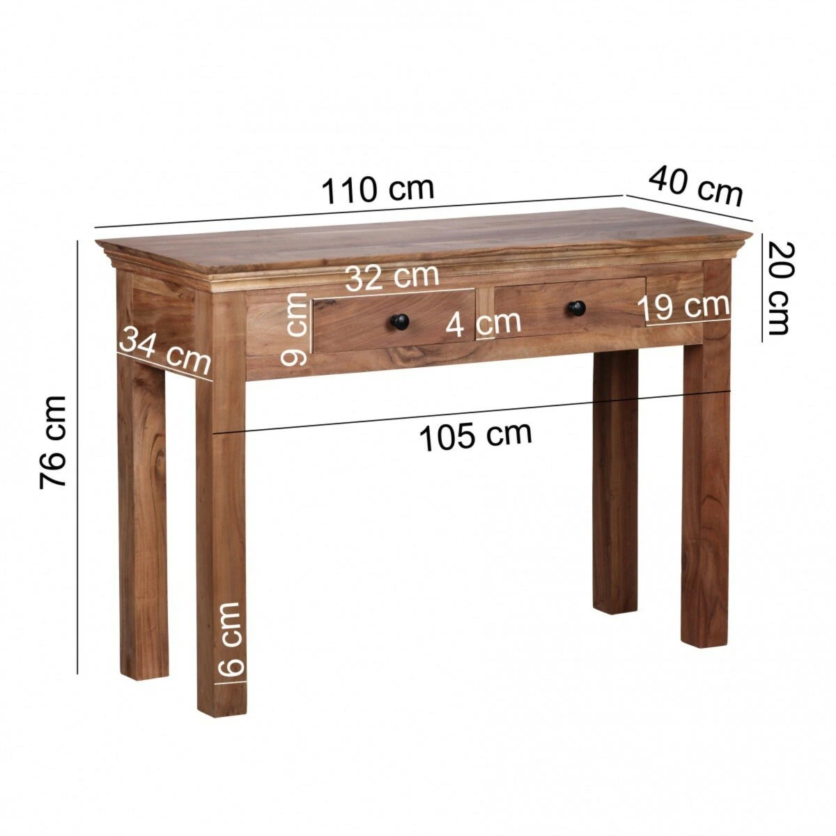 Egal ob als Schreib- oder Schminktisch, dieser Konsolentisch wird in jedem Fall eine hervorragende Figur machen. Die Tischplatte misst 110 x 40 cm und bietet somit reichlich Ablagefläche für die verschiedensten Utensilien, sowie die zwei vorhandenen Schubkästen. Das massive Akazienholz sorgt für eine stabile Konstruktion.