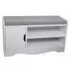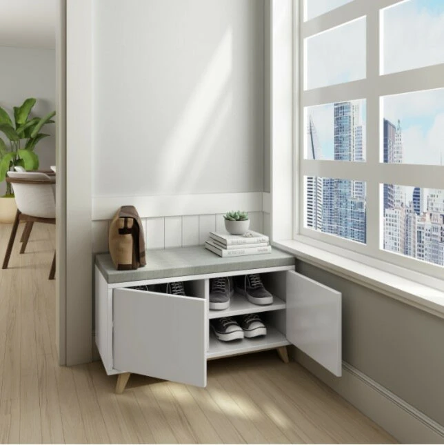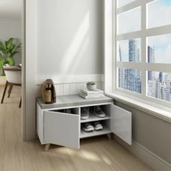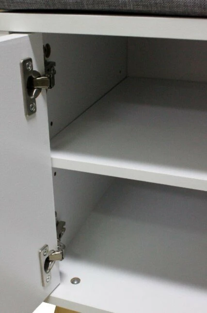 Das Sitzpolster macht die Schuhbank HAPPY HOME zu einer gemütlichen Sitzmöglichkeit beim Anziehen Ihrer Schuhe. Hinter den beiden Türen finden Sie vier geräumige Fächer, die Platz für etwa 4-6 Paar Schuhe bieten. Die weiß-graue Farbgebung lässt sich mit den unterschiedlichsten Stilen kombinieren und versprüht ein modernes Ambiente.