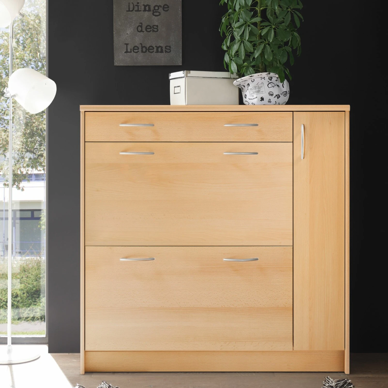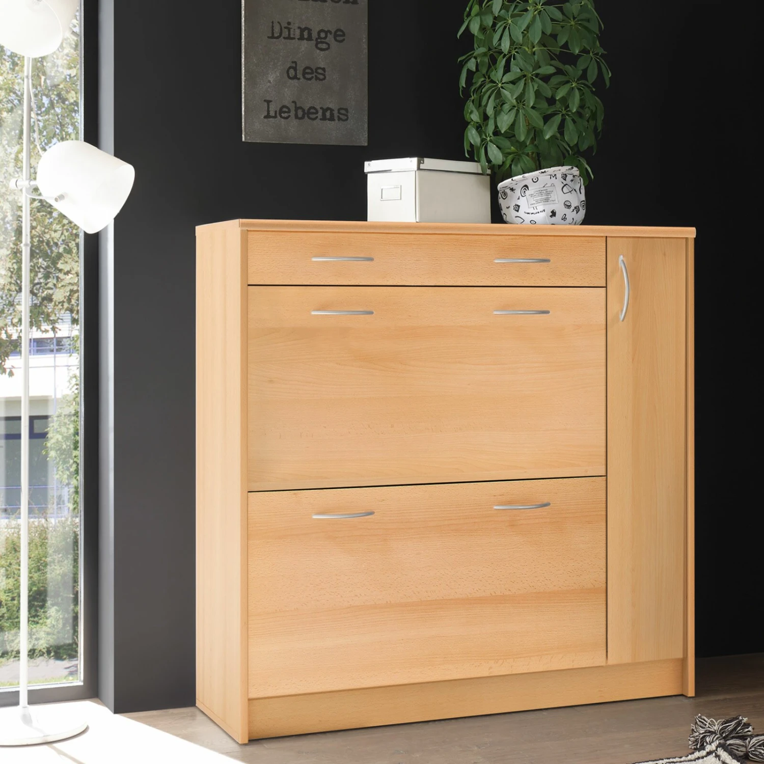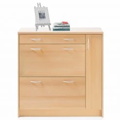Praktischer Schuhschrank in Buche Nachbildung, der über zwei Klappen für Ihr Schuhwerk sowie einem Schubkasten und einer Tür für beispielsweise Schuhputzzeug oder andere Utensilien verfügt. Die alufarbenen Griffe aus Kunststoff setzen sich optisch schön ab und erzeugen somit ein wohnliches Ambiente.