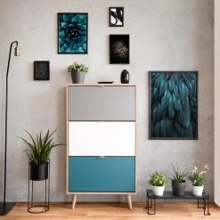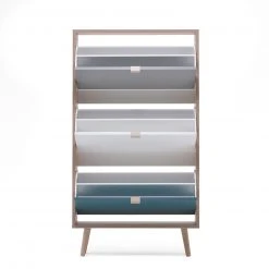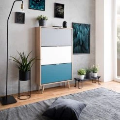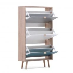 Bringen Sie Farbe in Ihre vier Wände. Der Schuhkipper mit seiner angenehmen und freundlichen Farbkombination aus Beige, Grau und Weiß sowie seinem Korpus aus edel aussehender Sonoma Eiche Nachbildung ist ein Augenschmaus. Dazu kommen noch die konischen Füße aus massivem Holz, die die moderne Optik unterstreichen und auch sehr stabil sind. Der Schrank ist auch praktisch, denn hier können Sie in drei Klappen bis zu 18 Schuhpaare unterbringen.