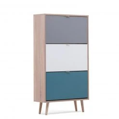 Bringen Sie Farbe in Ihre vier Wände. Der Schuhkipper mit seiner angenehmen und freundlichen Farbkombination aus Beige, Grau und Weiß sowie seinem Korpus aus edel aussehender Sonoma Eiche Nachbildung ist ein Augenschmaus. Dazu kommen noch die konischen Füße aus massivem Holz, die die moderne Optik unterstreichen und auch sehr stabil sind. Der Schrank ist auch praktisch, denn hier können Sie in drei Klappen bis zu 18 Schuhpaare unterbringen.