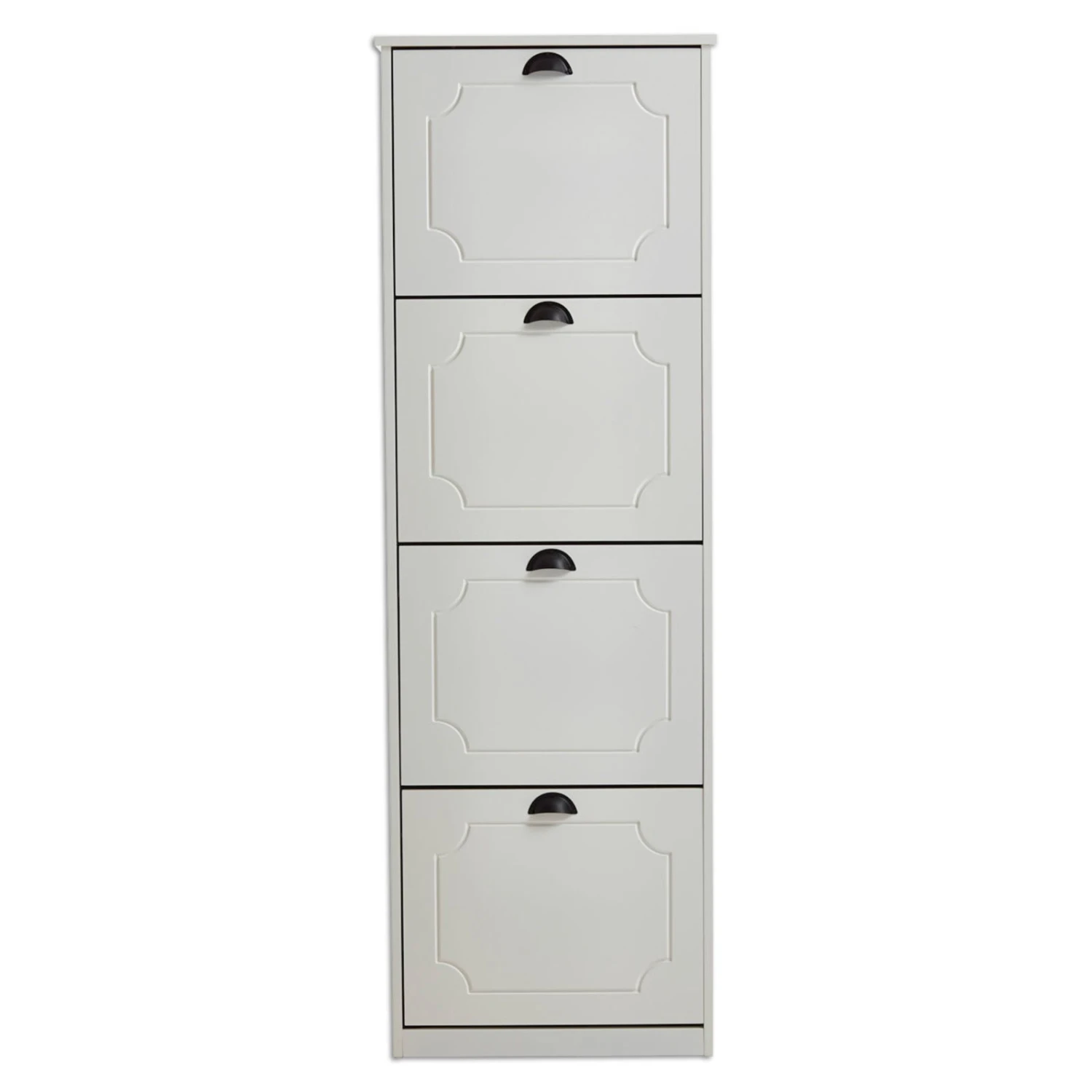 Nutzen Sie den Schuhkipper ADAM, um Ordnung in Ihrem Eingangsbereich zu halten. Hinter vier Klappen haben bis zu 20 Paar Schuhe Platz, sind gut verstaut und trotzdem griffbereit. Die Verzierung und die schwarzen Griffe kreieren ein wunderschönes Design, was auch zu einem Hingucker in Ihrer Diele wird.
