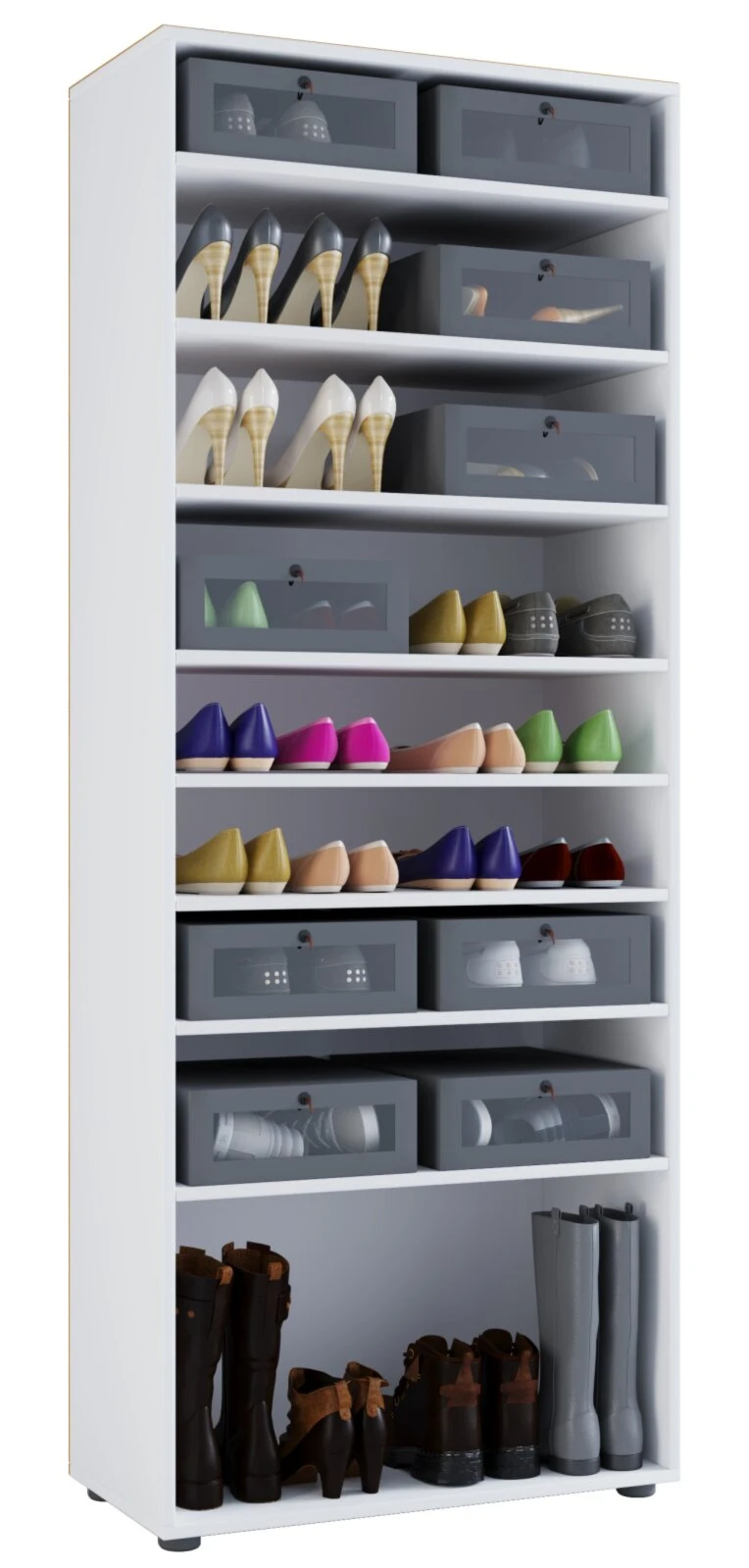 Das Schuhregal VANDOL I in Weiß bietet reichlich Stauraum für Ihre Schuhe. Platzieren Sie ihn im Eingangsbereich oder im Keller. Jeder in der Familie erhält sein Fach und so halten Sie einfach Ordnung. Alle Schuhe sind schnell griffbereit und in insgesamt 9 Fächern auch schnell wieder verstaut. Passen Sie die Einlegeböden Ihren Schuhen an.