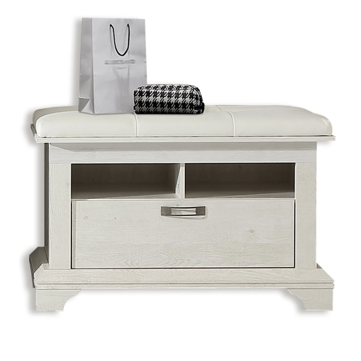 Bei diesem geräumigen Schuhschrank ist im Lieferumfang das Sitzkissen mit inbegriffen. Es sorgt für einen weichen Sitz beim Anziehen Ihrer Schuhe. In den zwei offenen Fächern, sowie im Schubkasten finden Sie Platz für Schuhe und weitere Utensilien.