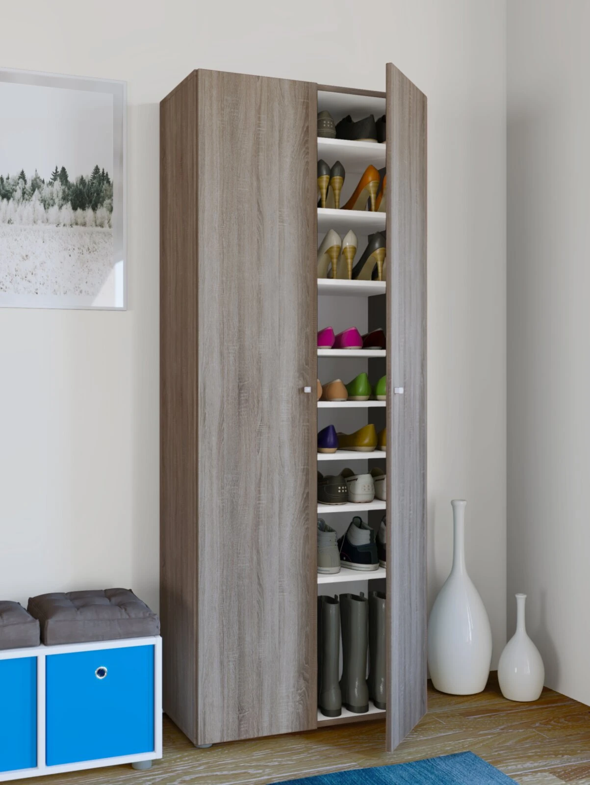 Ein Schuhschrank bringt Ordnung in Ihren Eingangsbereich oder Ihren Keller. Der Schrank VANDOL I in Sonoma Eiche ermöglicht Ihnen in neunen Fächern Ihre Schuhe aufzureihen und mit einem Griff herauszuholen. Egal, ob Ballerinas oder Gummistiefel, Sie können die Fächer Ihren Schuhen anpassen. Die beiden Drehtüren sind in Korpusfarbe gehalten und lassen die Schuhe aus dem Blickfeld verschwinden.
