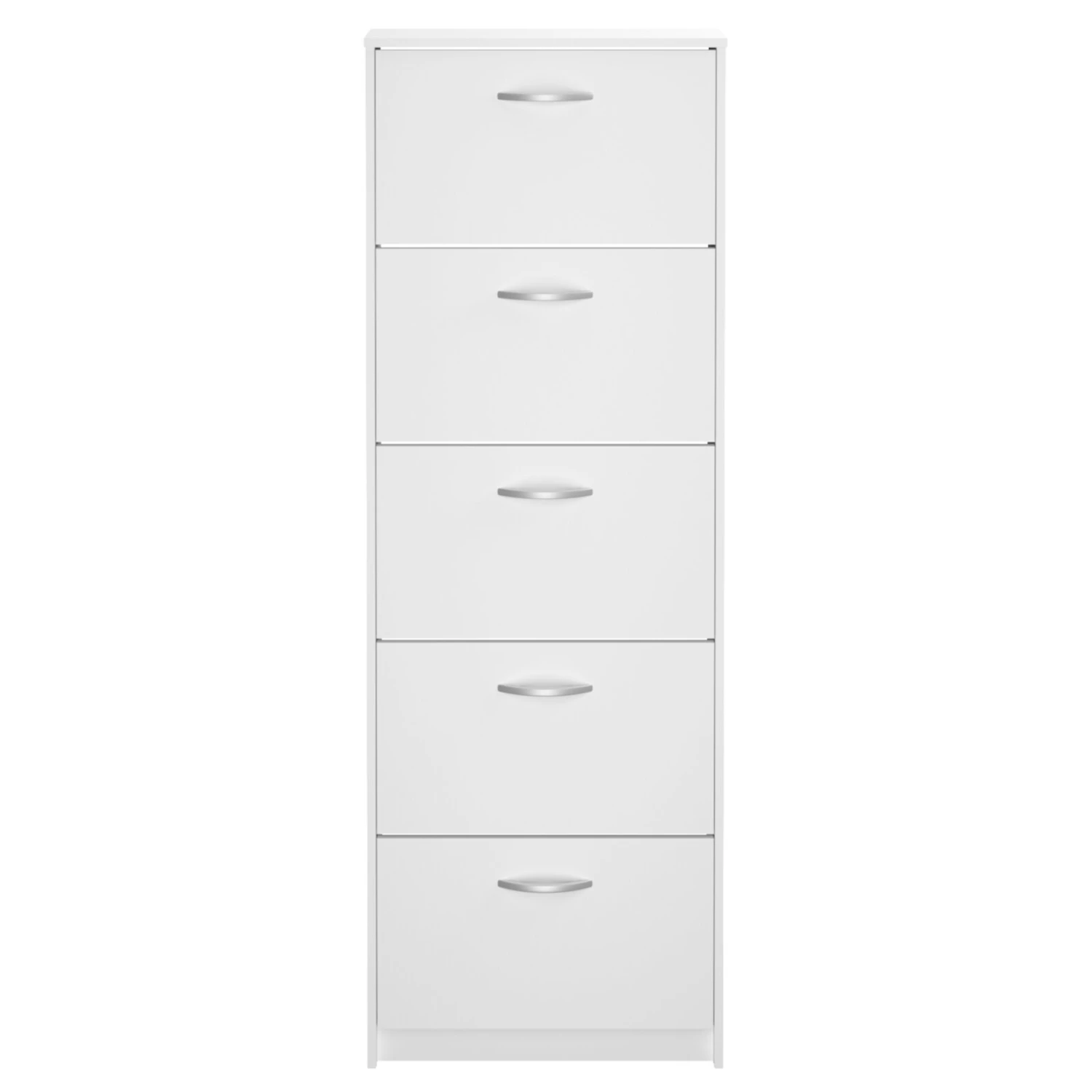 Ein Muss für jeden Platzsparer. Der weiße Schuhschrank passt perfekt in jeden Flur und in die fünf Klappen passen ganze zehn Paar Schuhe.