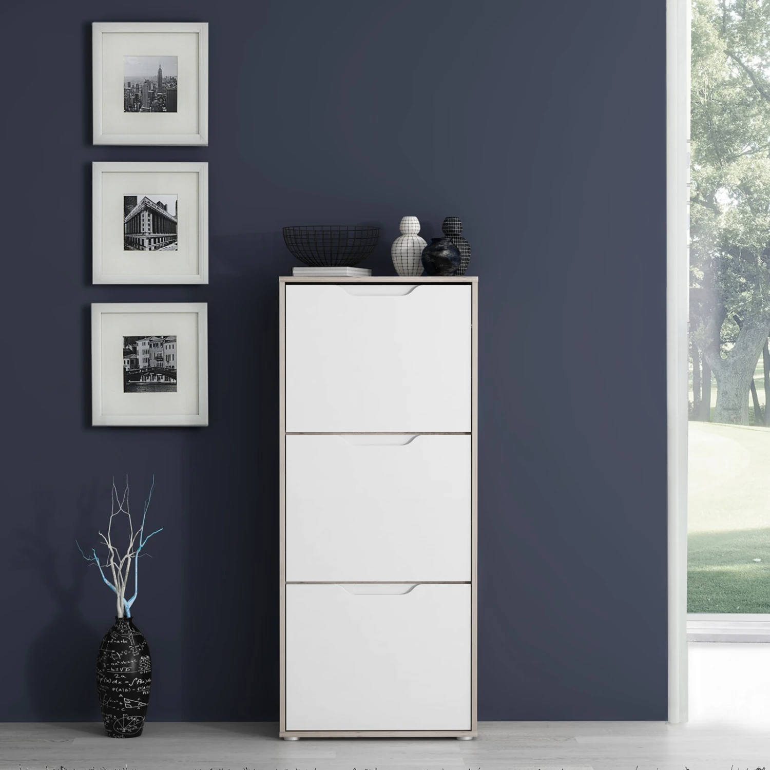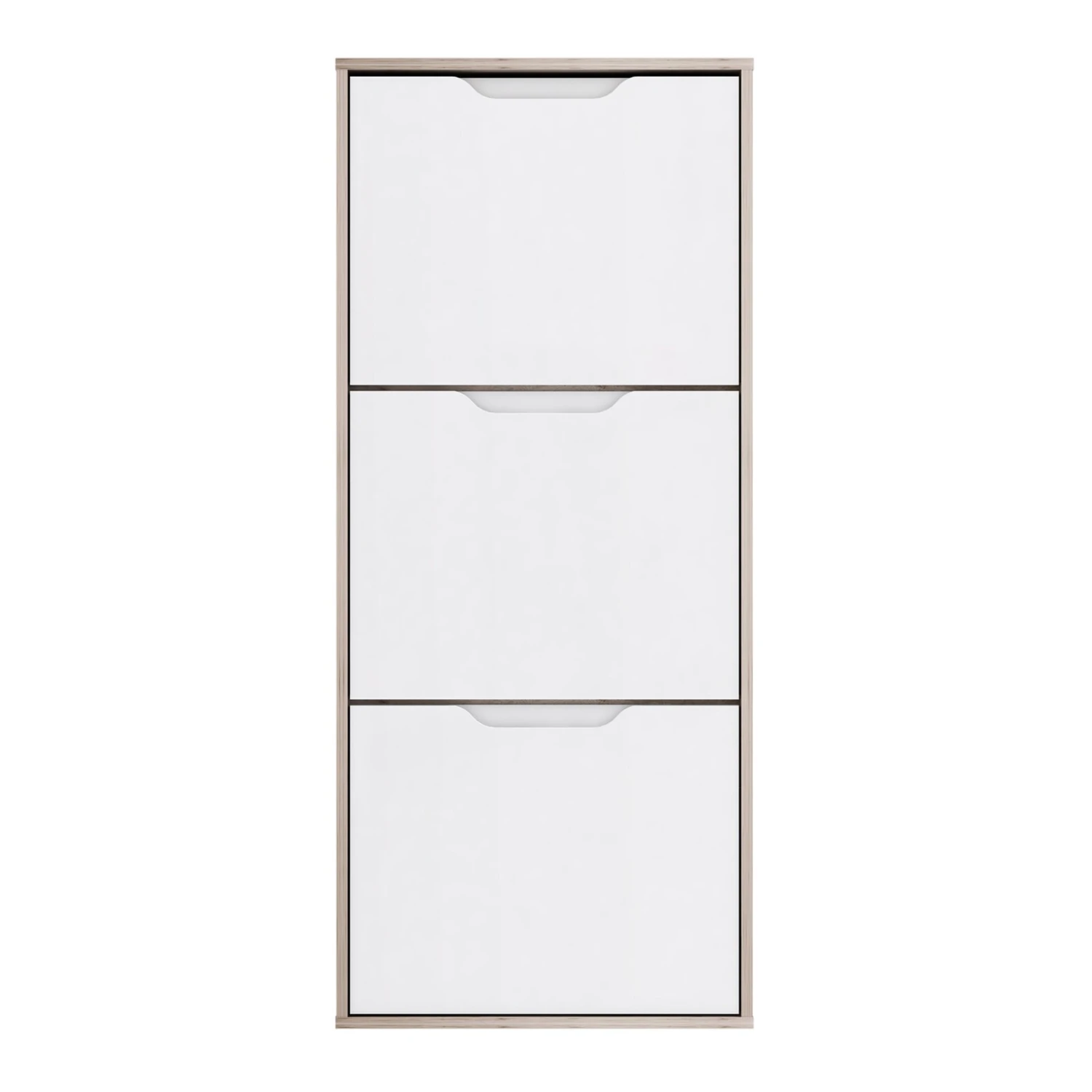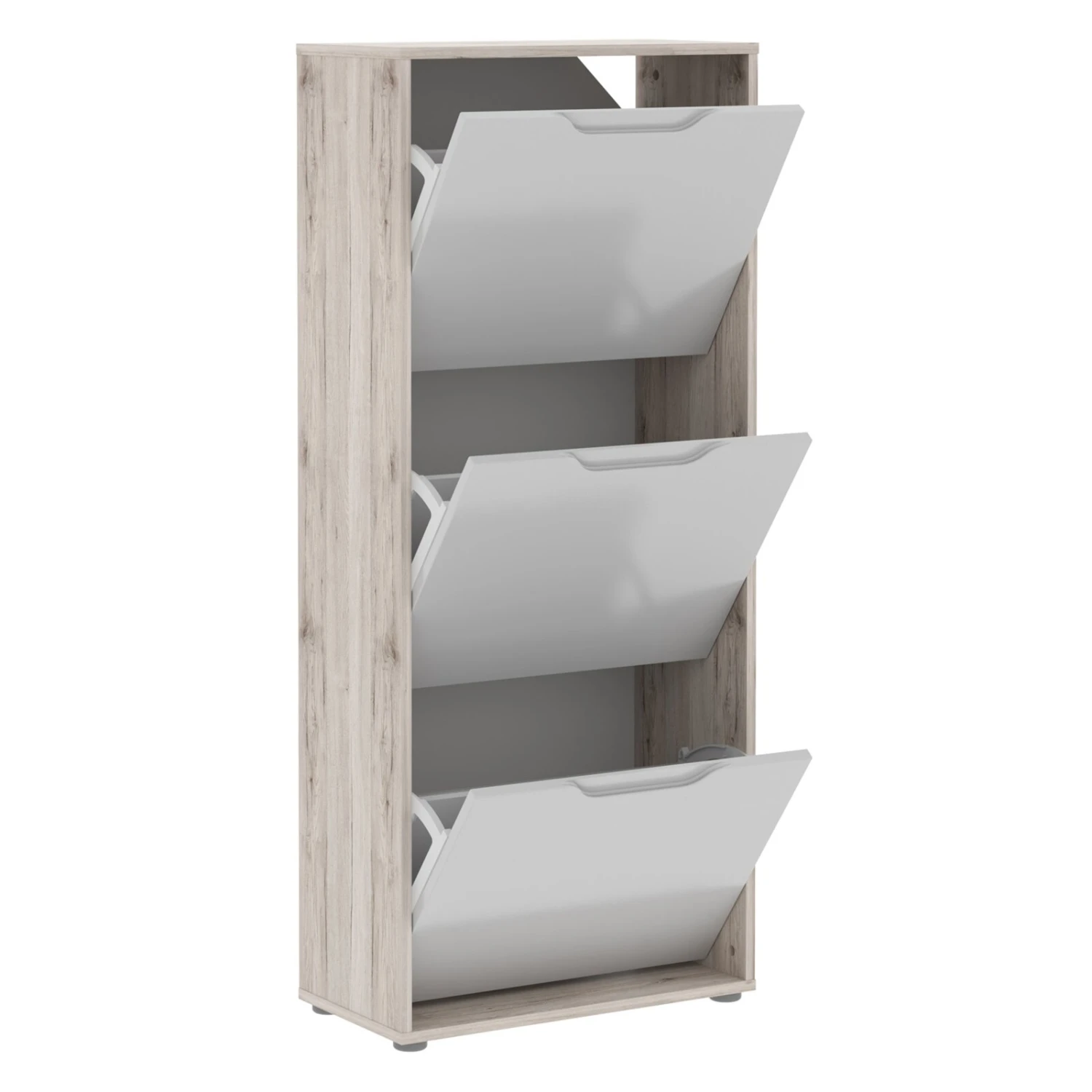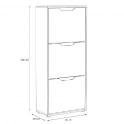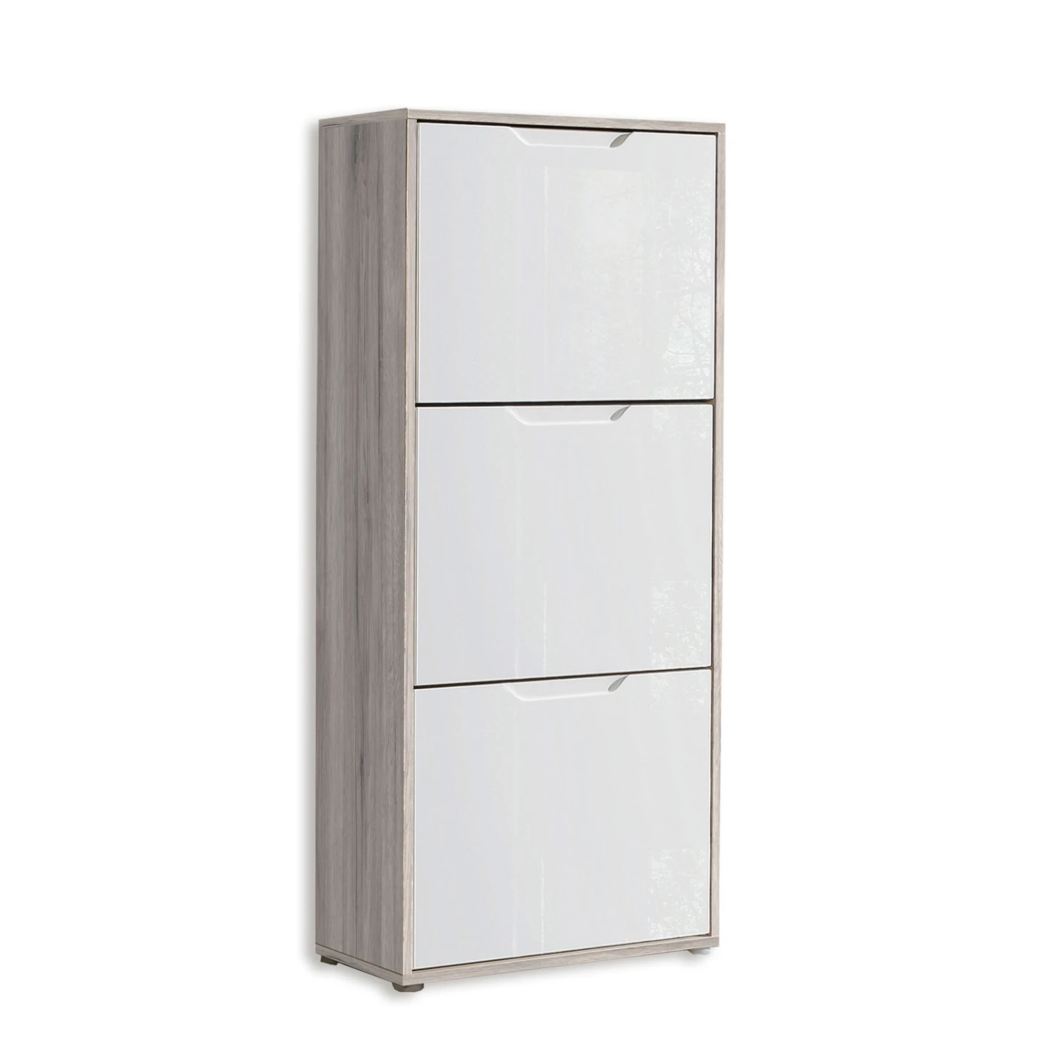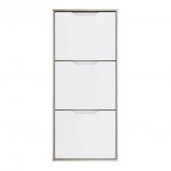 Stolpern Sie nicht länger darüber über Ihre Schuhe. Der Schuhschrank hilft Ihnen Ordnung zu schaffen. Die Hochglanzfront in Weiß wirkt sehr modern und die Sandeiche Optik an den Seiten bringt zugleich ein Stück Natur in Ihre 4 Wände.