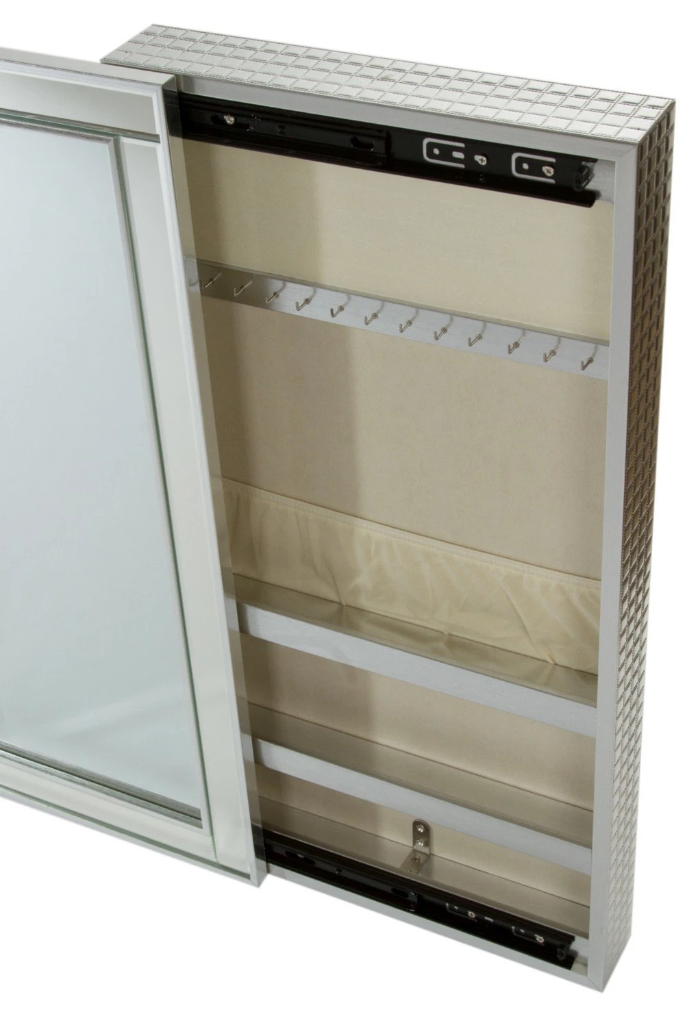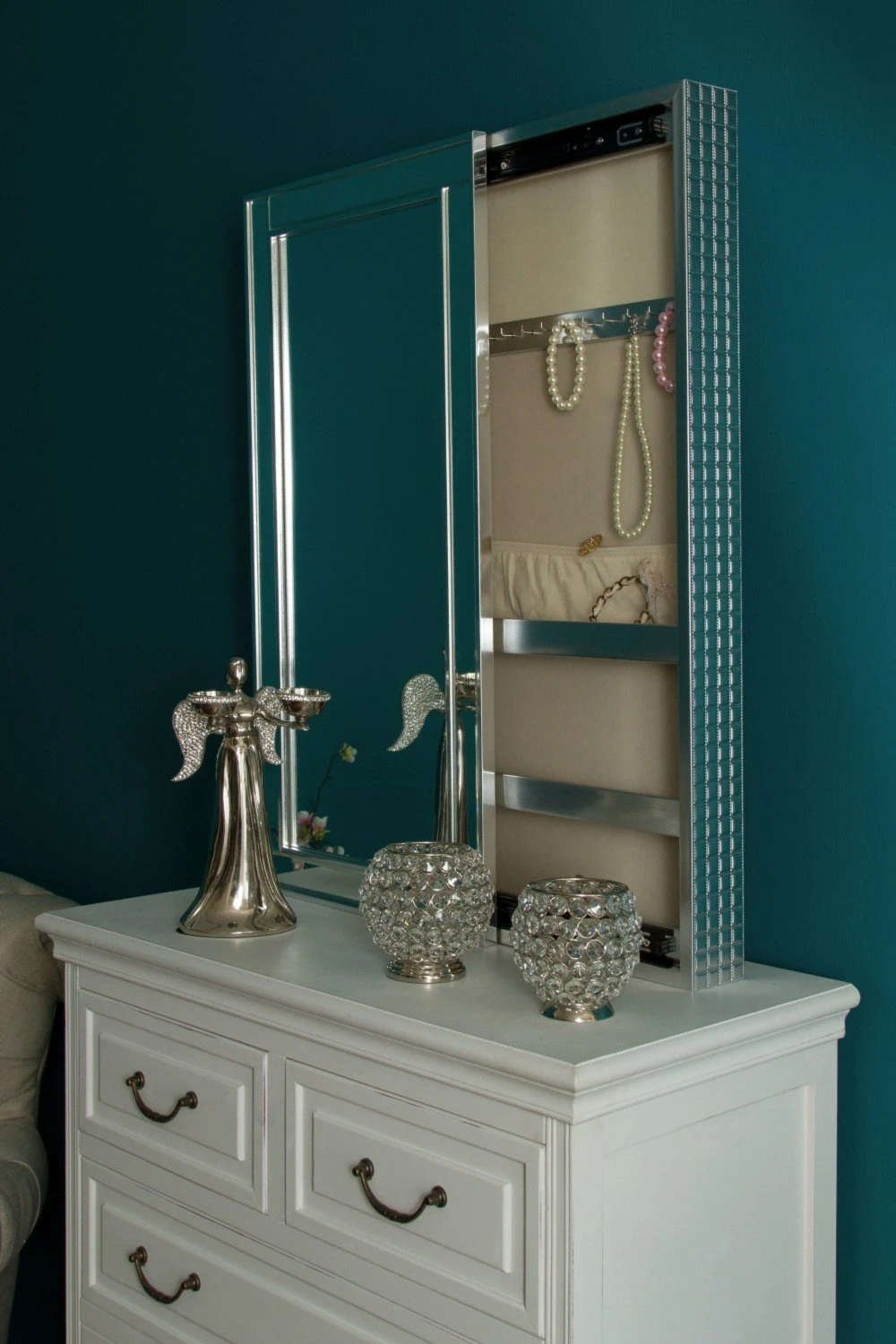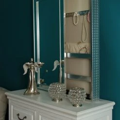 Dieser verspiegelte Schmuckschrank zeigt mit seiner Innenauftreilung und der facettenreichen Dekoration besondere Liebe zum Detail. Kettenhalter sowie Ringschienen warten hinter der verspiegelten Schiebetür auf Ihre Schmuckstücke und könnne anschleißend direkt betrachtet werden.