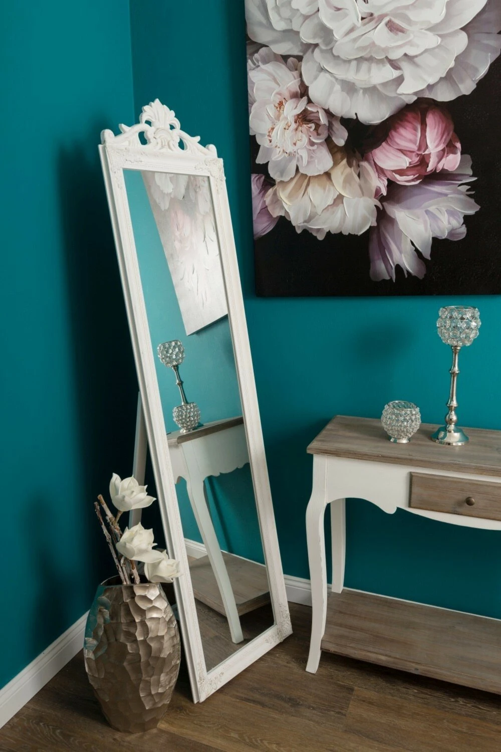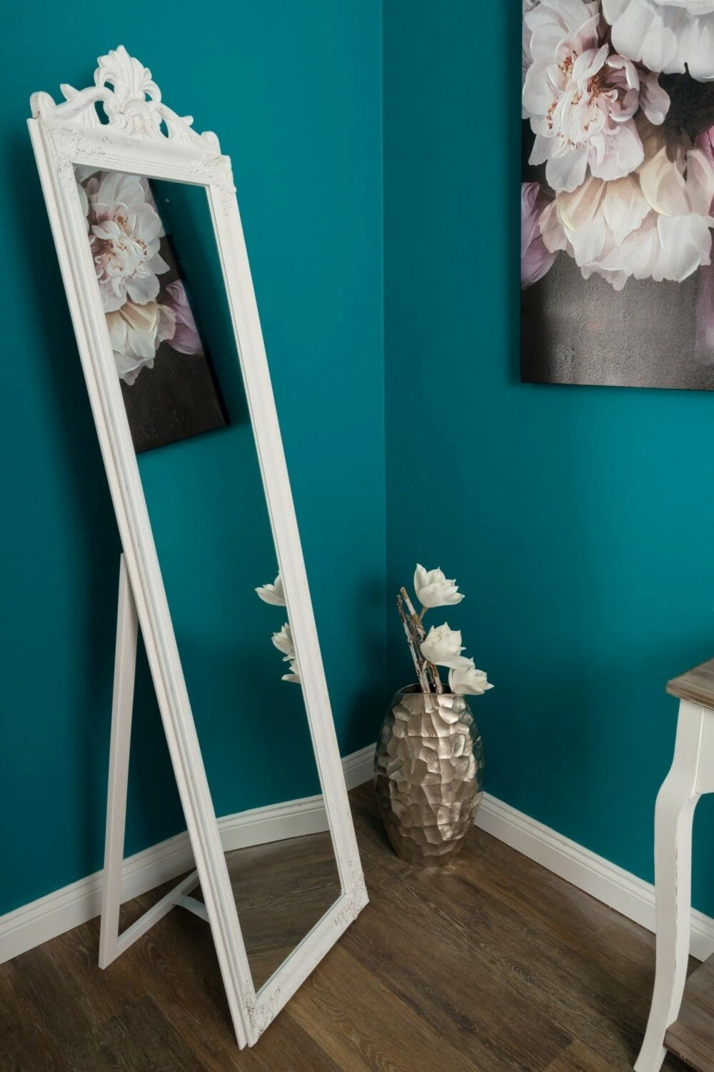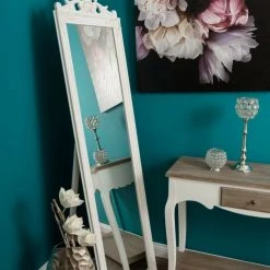 Dieser wunderschöne Standspiegel im Vintage-Stil lässt sich mithilfe des Ständers variabel neigen. Durch den Ornamentaufsatz und dem hochwertigen Facettenschliff erhält der Spiegel eine besondere Note. Außerdem ist der Spiegel auch zur Wandmontage geeignet, wenn der Ständer entfernt wird.