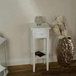 Der Telefontisch KLASSIK wurde in einem schlichten Weiß gehalten und bietet Ihnen eine kleine Schublade für diverse Utensilien und darunter eine kleine Ablage. Der Tisch fügt sich perfekt in Ihr Wohnambiente ein und bringt einen gewissen klassischen Flair mit sich. Ein absoluter Hingucker.