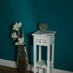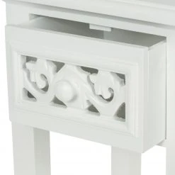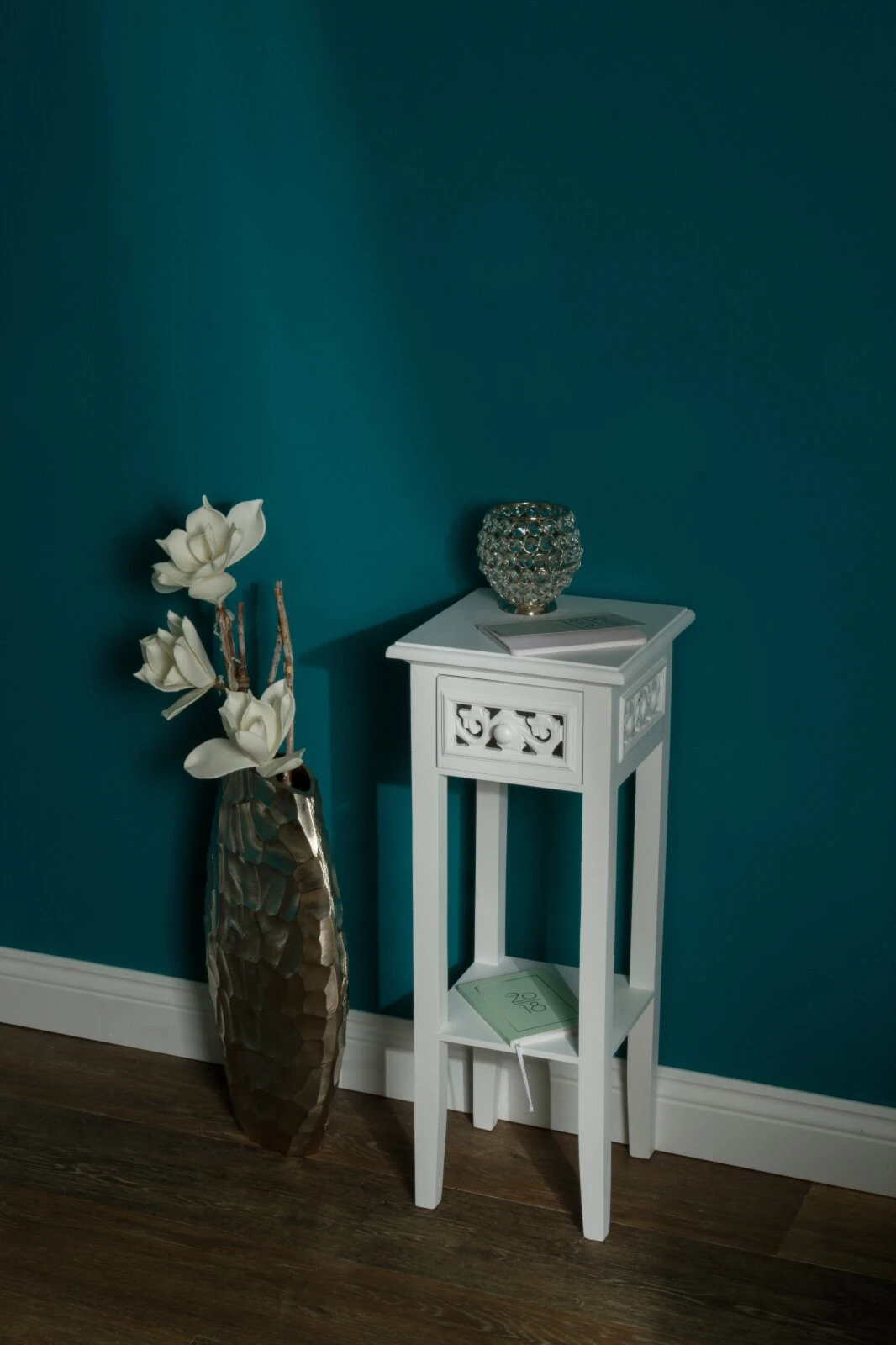 Der Telefontisch in Weiß ist durch seine formschönen Verzierungen ein absoluter Hingucker. Ein kleiner Schubkasten für Ihre Utensilien direkt unter der Ablage ist vorhanden.