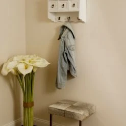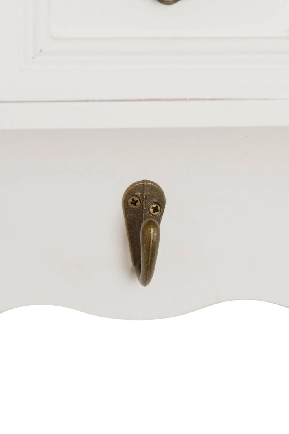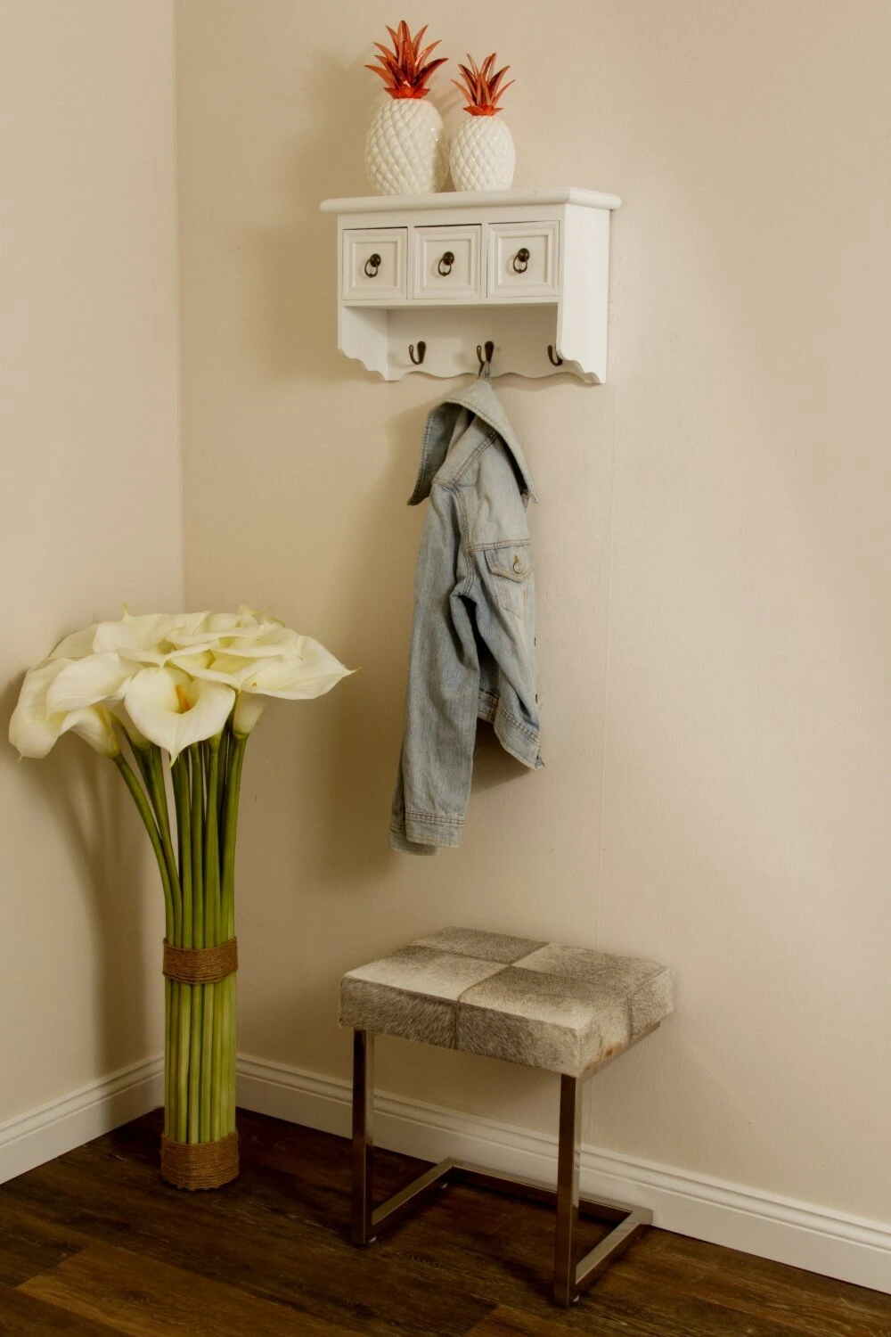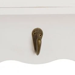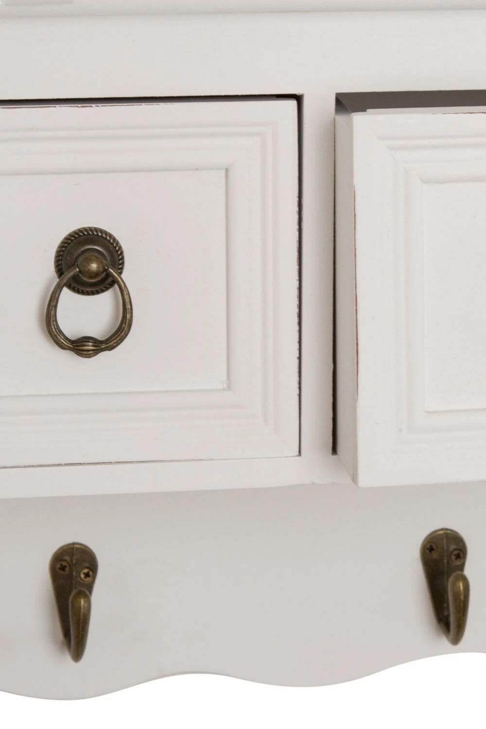 In einem klassischen Landhausstil und in Weiß präsentiert sich diese Wandgarderobe. Sie ist optimal für kleinere Eingangsbereiche geeignet, aber sorgt mit einer Breite von etwa 45 Zentimeter trotzdem für reichlich Stauraummöglichkeiten. An insgesamt drei Haken und in drei Schubkästen mit Metallringen können Sie einige Jacken aufhängen und viele Schlüssel und kleinere Utensilien unterbringen.