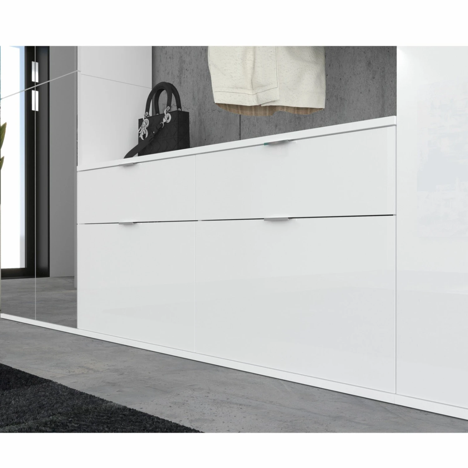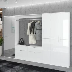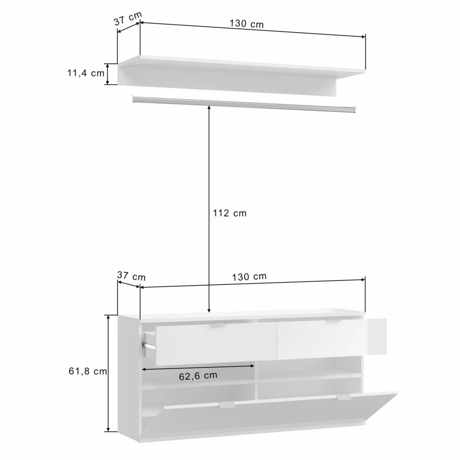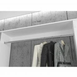 Platzieren Sie dieses Zwischenelement zwischen zwei Garderobenschränken und vervollständigen Sie Ihre Garderobe! Durch die Kleiderstange, den Oberboden und die Kommode verfügen Sie fortan über ausreichend Platz, um Ihre täglich benötigte Kleidung wie beispielsweise Jacken zu lagern.